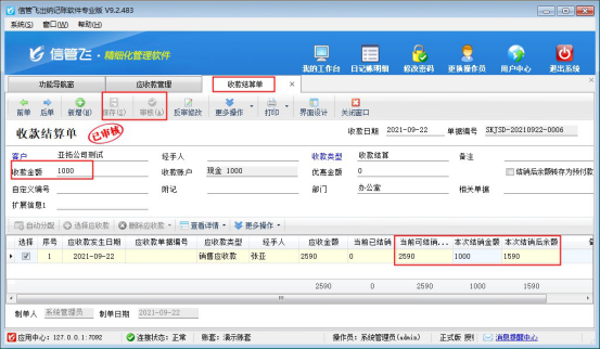 ????審核收款結(jié)算單后,返回至應收款管理界面,點擊“查詢”刷新,可看到結(jié)銷狀態(tài)由“未結(jié)銷”變?yōu)椤安糠纸Y(jié)銷”,對應的已結(jié)銷金額變?yōu)?000元,未結(jié)銷金額為剩余的1590元,如下圖所示: