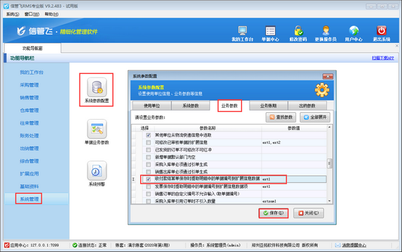 ????在功能導航窗選擇“系統(tǒng)管理”—》“系統(tǒng)參數(shù)配置”—》“業(yè)務參數(shù)”,進入業(yè)務參數(shù)設置界面,在“業(yè)務單據(jù)相關(guān)參數(shù)”中勾選“收付款結(jié)算單保存時提取明細中的單據(jù)編號到擴展信息數(shù)據(jù)項”參數(shù),并設置參數(shù)值,默認為ext1(擴展信息1),然后保存參數(shù)配置,如下圖所示。