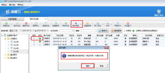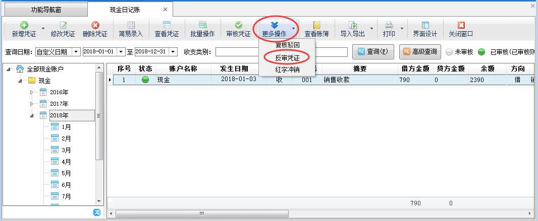 ????在現(xiàn)金日記賬列表界面,如圖2所示,點(diǎn)擊“更多操作”—》“反審憑證”,系統(tǒng)彈出提示信息“您確定要反審當(dāng)前憑證?”,點(diǎn)擊“確定”按鈕,如圖3所示。