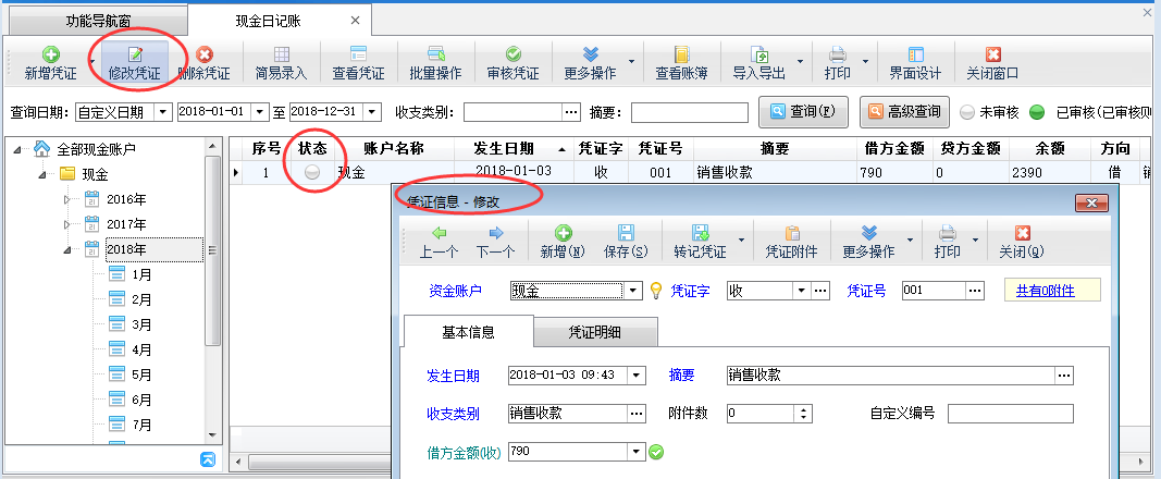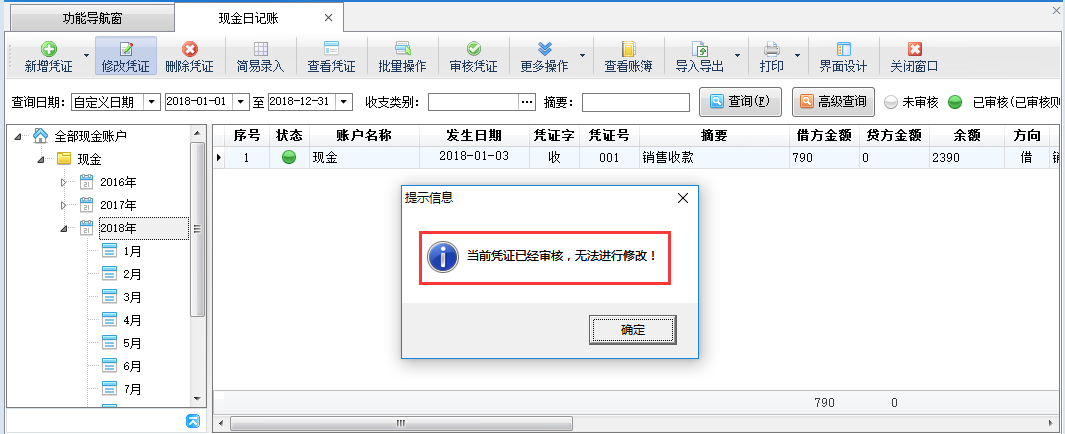 ????信管飛出納記賬軟件標(biāo)準(zhǔn)版和專業(yè)版在新增保存日記賬憑證后都可以直接審核憑證,憑證審核后,不允許直接刪除。客戶如果需要?jiǎng)h除已審核的憑證,需要先反審憑證,再進(jìn)行刪除。下面我們介紹一下在信管飛出納記賬軟件專業(yè)版中如何刪除已審核的日記賬憑證?
