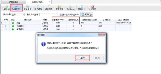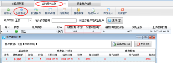 ????在功能導(dǎo)航窗點(diǎn)擊“出納管理”—》“出納期末結(jié)賬”,進(jìn)入出納期末結(jié)賬界面,選中當(dāng)前使用賬戶,點(diǎn)擊反結(jié)賬按鈕,反結(jié)賬完成后,相應(yīng)賬戶回退到上一個(gè)賬期,賬期的起始日期是2016-01-01,如下圖所示: