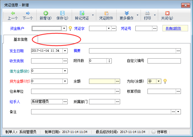 ????彈出“憑證信息”新增界面,轉(zhuǎn)記的出納憑證是銀行日記賬還是現(xiàn)金日記賬,取決于收款結(jié)算單上收款的資金賬戶,示例收款賬戶是“現(xiàn)金”,出納憑證的資金賬戶默認(rèn)是現(xiàn)金賬戶,在彈出的出納憑證新增界面,直接點(diǎn)擊“保存”按鈕即可。如下圖所示: