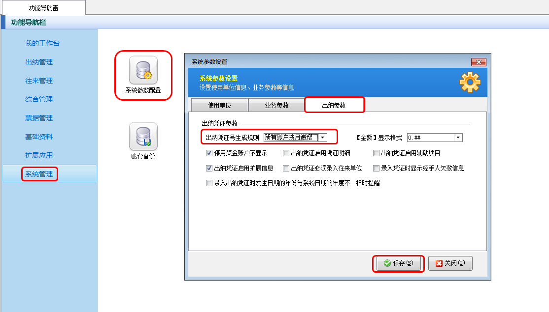 ????在功能導(dǎo)航窗點(diǎn)擊“系統(tǒng)管理”——》“系統(tǒng)參數(shù)配置”——》“業(yè)務(wù)參數(shù)”可以進(jìn)入到“業(yè)務(wù)參數(shù)”配置界面,在出納憑證相關(guān)參數(shù)內(nèi)打勾啟用“出納憑證摘要只能選擇不能隨意輸入”參數(shù),然后保存,如下圖所示: