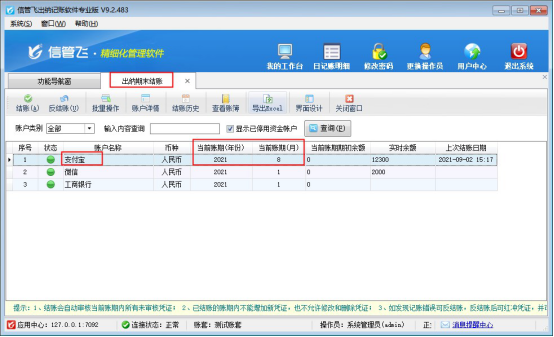 ????在功能導(dǎo)航窗,點(diǎn)擊“出納管理”——》“出納期末結(jié)帳”,進(jìn)入“出納期末結(jié)帳”界面,選擇賬戶名稱“支付寶”,可看到當(dāng)前賬期是2021-8月,如下圖所示: