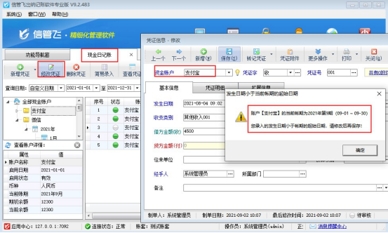 ????出納記賬軟件登記日記賬憑證時(shí),發(fā)生日期默認(rèn)取電腦操作系統(tǒng)日期,另外如需要補(bǔ)錄出納憑證,系統(tǒng)也支持修改日記賬憑證的發(fā)生日期進(jìn)行補(bǔ)錄出納憑證,部分用戶在修改完日記賬發(fā)生日期保存憑證時(shí)可能會出現(xiàn)“您錄入的發(fā)生日期小于賬期的起始日期,請修改后再保存!”的提示,這是因?yàn)樵搼{證錄入的發(fā)生日期小于該賬戶賬期的起始日期導(dǎo)致的。本篇文章介紹一下該如何解決這個(gè)問題。