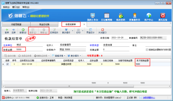 ????收款結(jié)算單保存審核完成后,對應(yīng)的應(yīng)收款管理結(jié)銷狀態(tài)會變?yōu)椤耙呀Y(jié)銷”,結(jié)銷操作可參考此文章:出納記賬軟件中如何對應(yīng)收款進(jìn)行收款結(jié)算?