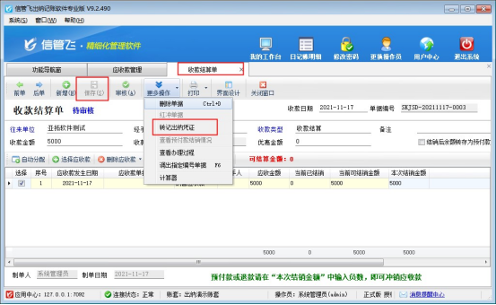 ????參數(shù)啟用完成后,在“往來管理”中打開應(yīng)收款管理,選擇狀態(tài)為“未結(jié)銷”的應(yīng)收款記錄,點(diǎn)擊收款結(jié)算,在彈出的結(jié)算單界面上,正常結(jié)算應(yīng)收款,保存結(jié)算單后在“更多操作”下點(diǎn)擊“轉(zhuǎn)記出納憑證”(需要自動提醒轉(zhuǎn)記可參考此文章設(shè)置:出納軟件如何設(shè)置結(jié)算單保存或?qū)徍藭r(shí)提醒轉(zhuǎn)記日記賬?),如下圖所示: