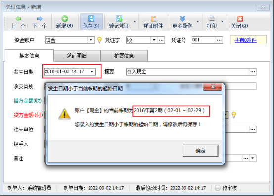 # 6.4.62 出納記賬軟件新增憑證時(shí)提示“發(fā)生日期小于當(dāng)前賬期的起始日期”,如何解決?