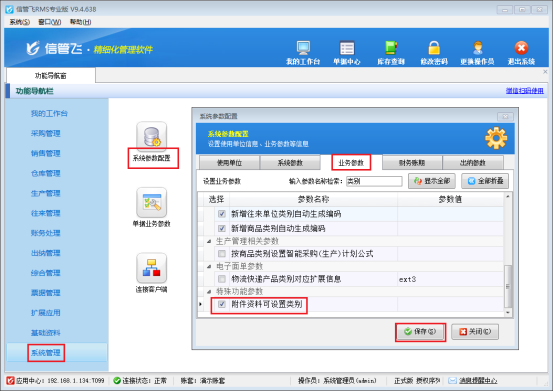 在日常的業(yè)務處理中,單據的附件資料對于信息的完整性和準確性至關重要。信管飛RMS軟件深知這一點,因此特別支持在保存單據后導入對應的附件資料,無論是圖片、Excel還是其他格式,都能輕松應對。 然而,當附件數量逐漸增多時,如何對它們進行有效分類管理就成了一個亟待解決的問題。信管飛RMS軟件考慮到這一需求,提供了靈活的附件資料分類管理功能。只需通過簡單的設置,即可對附件資料進行分類管理。 在功能導航窗中,點擊“系統(tǒng)管理”-“系統(tǒng)參數配置”-“業(yè)務參數”,