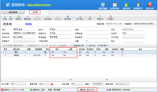 信管飛送貨單軟件(原“紅管家送貨單軟件”)支持多個(gè)操作員登錄使用軟件,可以對不同的操作員設(shè)置不同的權(quán)限。有些客戶不允許操作員查看商品銷售價(jià),軟件支持在“操作員管理及授權(quán)”中設(shè)置操作員不能查看銷售價(jià)格,下面我們詳細(xì)介紹一下操作員不可查看商品銷售價(jià)的設(shè)置方法。 登錄信管飛送貨單軟件,在功能導(dǎo)航窗點(diǎn)擊“系統(tǒng)管理”—》“操作員及授權(quán)”,即可進(jìn)入“操作員管理及授權(quán)”界面,如圖1所示,以操作員“張三”為例,鼠標(biāo)選中操作員后,點(diǎn)擊“其他操作權(quán)限”,取消勾選“查看商品銷售價(jià)”,然后點(diǎn)擊“保存權(quán)限設(shè)置”即可。圖1 操作員管理及授權(quán)界面&n