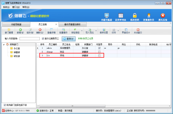 信管飛軟件支持設(shè)置多個(gè)可登錄操作員,可不同人員登錄軟件進(jìn)行操作開單。在員工信息界面,可登錄員工對(duì)應(yīng)的可登錄狀態(tài)顯示勾選,如下圖所示: 如何設(shè)置員工“李拓”可登錄狀態(tài)取消勾選?在功能導(dǎo)航窗點(diǎn)擊“系統(tǒng)管理”—》“操作員及授權(quán)”界面。選擇操作員“李拓”,點(diǎn)擊工具欄“刪除操作員”,刪除成功后員工不能再登錄軟件,如下圖所示: 刪除成功后,返回至“員工信息”界面,點(diǎn)擊“查詢”刷新,可看到員工“李拓”的可登錄已取消勾選,如下圖所示: