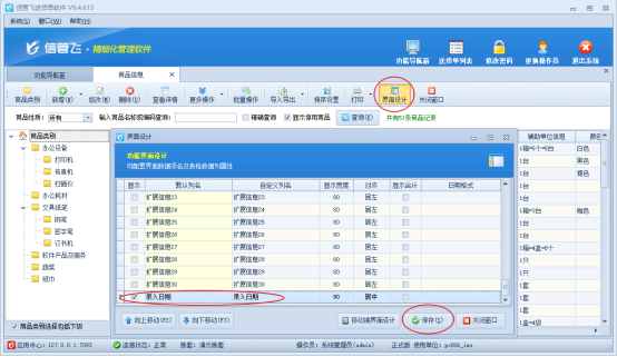 信管飛RMS軟件、信管飛送貨單軟件等需要先維護(hù)基礎(chǔ)資料--商品信息及客戶信息,后期實(shí)際開單操作可以直接選擇已維護(hù)信息,有用戶咨詢需要查看商品的錄入日期,在軟件中如何查看?本文以信管飛送貨單軟件為例進(jìn)行示范。 在功能導(dǎo)航窗點(diǎn)擊“基礎(chǔ)資料”—》“商品信息”,在“商品信息”界面點(diǎn)擊“界面設(shè)計(jì)”勾選“錄入日期”數(shù)據(jù)項(xiàng),然后點(diǎn)擊“保存”按鈕保存界面配置。 歡迎下載試用可自定義設(shè)置界面設(shè)計(jì)的軟件:信管飛送貨單軟件