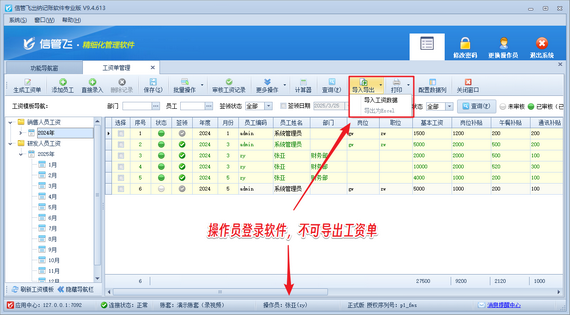在財(cái)務(wù)管理日益精細(xì)化的今天,一款專業(yè)的出納記賬軟件顯得尤為重要。信管飛出納記賬軟件憑借其強(qiáng)大的工資管理功能,成為眾多企業(yè)的首選。該軟件不僅支持自定義工資模板,還能快速生成工資單,極大地提升了工作效率。 尤為值得一提的是,信管飛出納記賬軟件在安全性上也下足了功夫。通過設(shè)置操作員權(quán)限,企業(yè)可以確保敏感信息的保密性。例如,禁止操作員導(dǎo)出工資記錄,有效防止信息泄露。 具體操作步驟簡單明了:登錄軟件后,進(jìn)入“系統(tǒng)管理”的“操作員及授權(quán)”界面,選擇對(duì)應(yīng)操作員并取消其工資單管理的“導(dǎo)出”權(quán)限,保存設(shè)