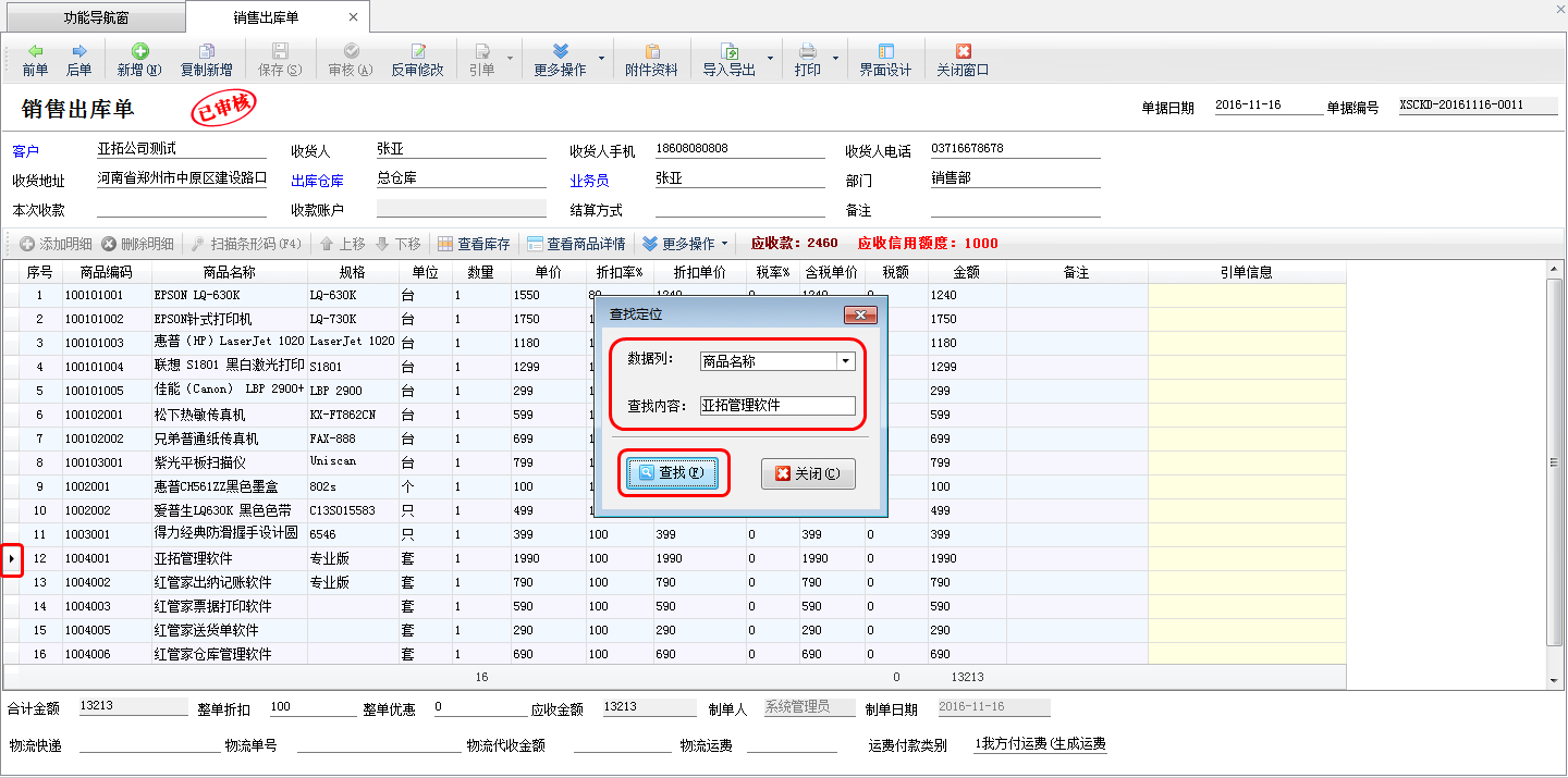 亞拓管理軟件(精細化管理軟件、進銷存管理軟件、記賬軟件)及紅管家倉庫管理軟件(庫存管理軟件)業務單據明細內支持查找定位功能,可以快速定位單據明細內滿足條件的明細記錄,本篇文章以亞拓管理軟件為例詳細介紹下業務單據明細內查找定位功能如何使用。 打開業務單據(本篇文章以“銷售出庫單”為例),在單據明細工具欄點擊“更多操作”—》“查找定位 Ctrl+F”即可打開“查找定位”對話框(圖一),我們選擇“數據列”名稱,輸入查找內容,點擊“查找”按鈕即可快速在單據明細內查找滿足條件的明細記錄,如需要在單據明細內快速查找商品名稱為“亞拓管