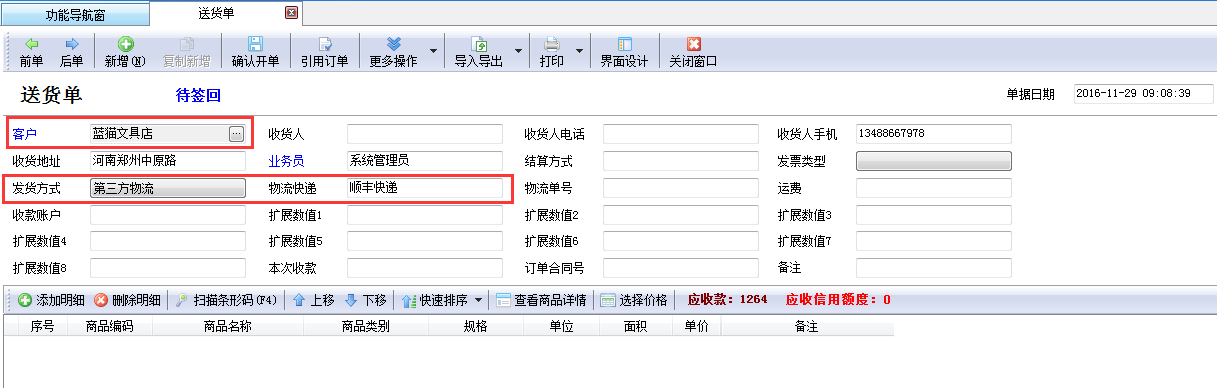 受客戶意向、地域及其他因素所影響,我們給不同的客戶進行發貨時采用的物流快遞公司可能也會不一樣,亞拓管理軟件(進銷存管理軟件)、紅管家送貨單軟件(送貨管理軟件)內都可以對每一個客戶信息設置默認的物流快遞信息,本篇文章以紅管家送貨單軟件為例詳細介紹一下如何對不同的客戶設置不同的物流快遞信息,開單時可以進行自動調取? 在功能導航窗點擊“基礎資料”—》“客戶信息”打開客戶信息維護界面,選擇其中一個客戶資料進行修改,維護“發貨方式”為“第三方物流”且設置默認物流快遞信息,如下圖一中所示,客戶“藍貓文具店”的默認發貨物流快遞為“順豐