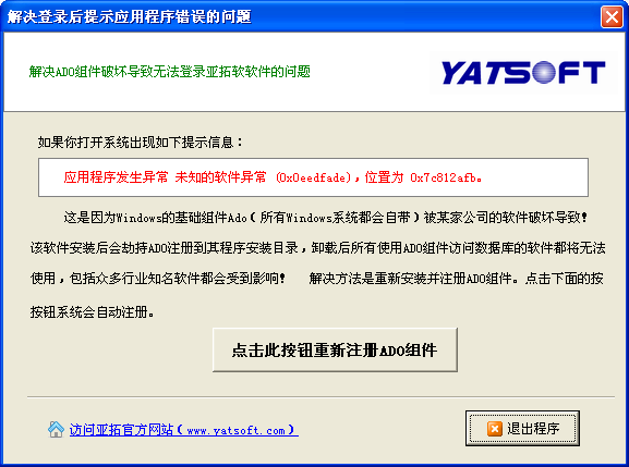 部分用戶機器在登錄出納記賬系統或商業進銷存系統時,啟動界面過后,直接報錯并退出系統。系統提示錯誤信息如下: 出現這個錯誤提示,是由于Windows的基礎組件ADO數據庫訪問引擎被某家公司的軟件破壞導致。安裝該軟件后,會自動劫持ADO注冊到其程序所在目錄,卸載該軟件后后所有使用ADO數據庫訪問引擎的軟件都將無法使用,包括眾多知名行業軟件!我們對相關問題已經進行保存和取證,也感謝眾多熱心用戶的及時反饋! 為此,我們專門開發了一個小工具,用于重新注冊ADO。使用方法如下:(1)下載亞拓軟件ADO注冊程序