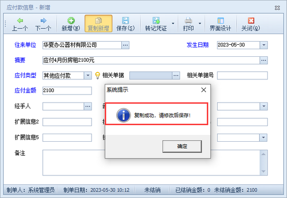 演示視頻觀看鏈接:出納記賬軟件如何復制新增應付款演示視頻 信管飛出納記賬軟件應付款管理功能可以對采購應付款、采購預付款、采購退貨應退款、期初應付款、其他應付款(如房租)等各類應付款項進行集中管理。其中房租一般是固定的,每個月都一樣,系統支持復制上個月的應付款房租數據生成新的應付款,本篇文章介紹一下操作方法。 在功能導航窗點擊“往來管理”—》“應付款管理”打開應付款管理界面,如下圖所示。 選擇需要被復制的房租應付款信息,工具欄點擊“修改”按鈕,在打開的