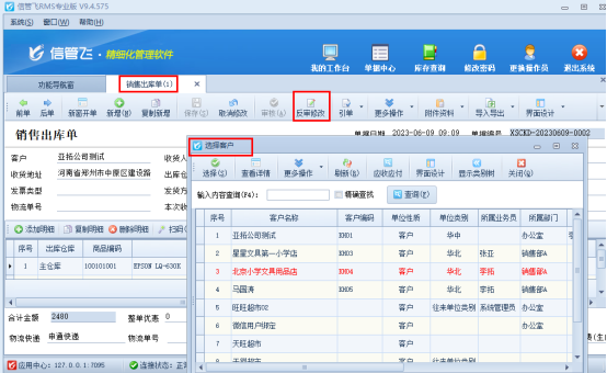信管飛RMS軟件、信管飛送貨單軟件、信管飛倉庫管理軟件等在開銷售單時客戶名稱可以直接輸入,也可以通過選擇錄入,開單保存審核后,之前版本不允許修改往來單位名稱,造成客戶名稱輸入錯誤后只能重新開單,最新版已更改為審核后允許修改往來單位名稱和倉庫,如下圖所示:【注意】 修改往來單位名稱和倉庫后,對應的應收應付款記錄和倉庫庫存會自動更新。 應收款管理中開對應結算單的銷售出庫單不允許反審修改,需要修改先紅沖對應的結算單記錄。 需要使用此