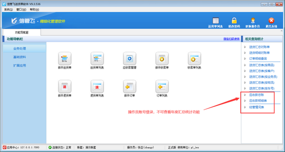 演示視頻觀看鏈接:http://m.uzaiuzai.com/news/video/202301/1857.html 信管飛送貨單軟件支持送貨年度匯總功能,可統計出年度內每個商品總銷售數量以及總銷售金額,另外也支持按客戶(業務員)統計匯總年度內每個客戶(業務員)的總銷售合計金額,如下圖所示。 如果不希望員工賬號登錄查看年度匯總統計功能,需要設置一下操作員權限,本文示范一下具體操作步驟。 用系統管理員賬號登錄軟件,在功能導航窗點擊“系統管理”—》“操