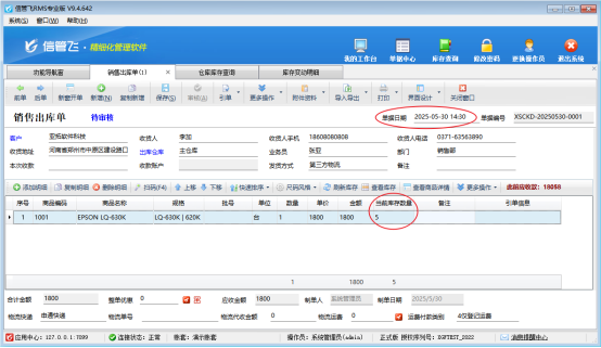 用戶在使用進銷存軟件過程中,遇到在銷售出庫單界面點擊刷新庫存按鈕,當前庫存數量未更新為該商品的當前實際庫存數量,是什么原因呢,該如何解決? 例如商品名稱“EPSON LQ-630K”,倉庫庫存數量是5個,出庫單開單界面點擊刷新庫存當前庫存數量是0,經檢查發現原因是該商品入庫單發生時間是5月30日14點22分,銷售單出庫時間是5月30日10點,如圖 解決方法:將銷售出庫單時間修改為入庫時間之后,比如5月30日14點30分,再點擊刷新庫存,即