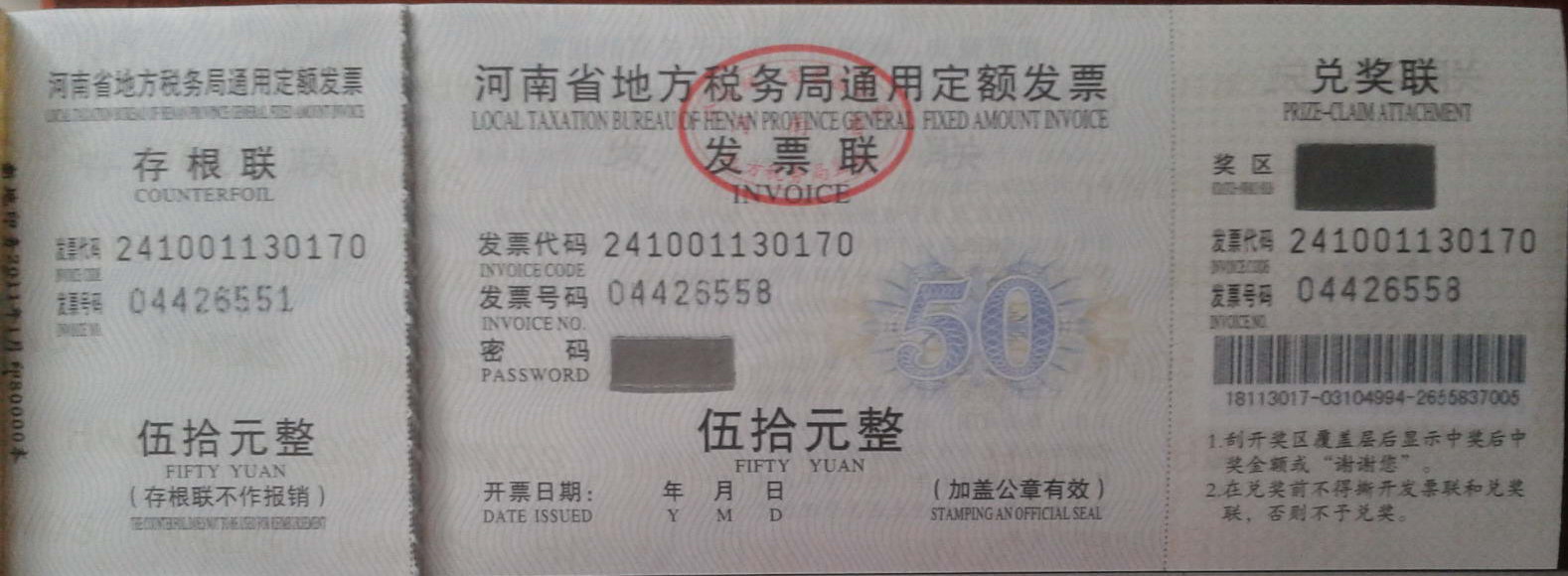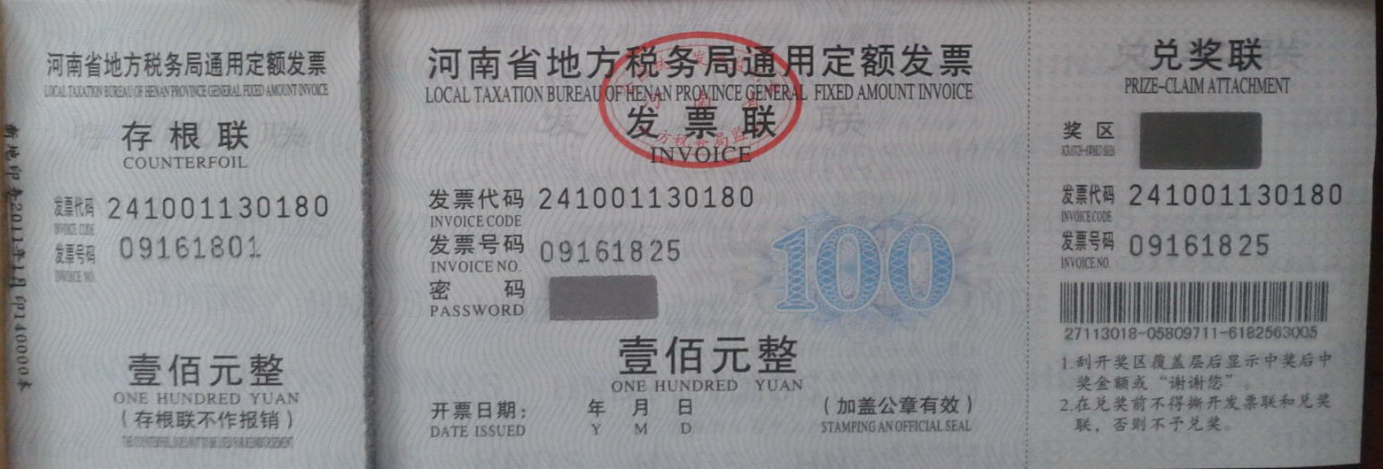 我公司目前針對非項目類產(chǎn)品銷售統(tǒng)一開具《河南省地方稅務(wù)局通用定額發(fā)票》,發(fā)票面值為100元/50元/10元,2011年4月前有少量《河南省鄭州市文化體育娛樂服務(wù)業(yè)定額》發(fā)票,發(fā)票面額為200元/100元/10元,均為正規(guī)發(fā)票,對我公司任何違規(guī)開票行為,用戶可隨時撥打河南省地方稅務(wù)局服務(wù)熱線12366-2進(jìn)行舉報和投訴。