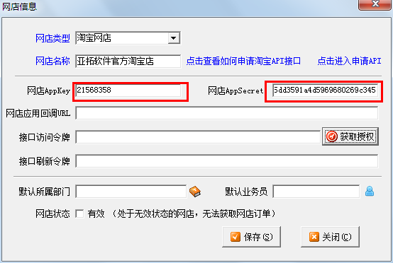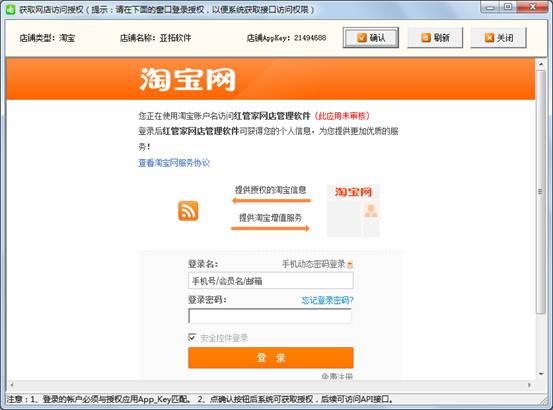 在“網(wǎng)店信息”窗口點擊 “獲取授權(quán)”按鈕進(jìn)行測試,注意由于目前淘寶API的限制,淘寶3鉆以下店鋪申請的API的授權(quán),24小時就會過期,屆時需要重新登錄一下(系統(tǒng)在授權(quán)失效時會彈出授權(quán)窗口,登錄一下即可)。