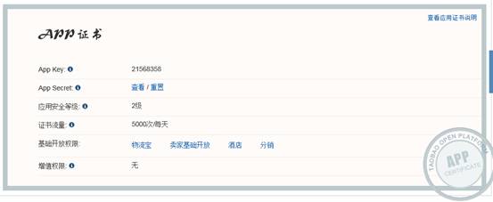 (3)進(jìn)入應(yīng)用基本信息頁面,如下圖所示,下圖中的AppKey 和 App Secret需要在紅管家網(wǎng)店管理軟件中要使用。