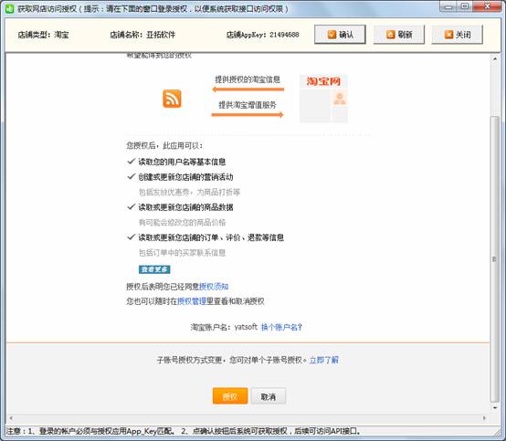 用申請?zhí)詫?/SPAN>API的店鋪淘寶帳戶登錄一下,然后點“授權(quán)”按鈕,