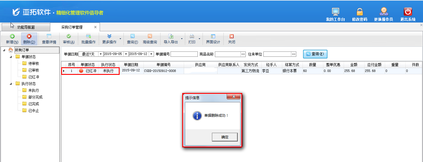 配置完之后再回到剛剛“已紅沖”的那個單據(jù)進行刪除,此時就可以刪除成功了,如下圖所示: