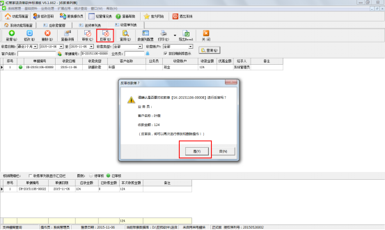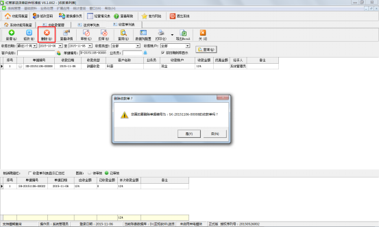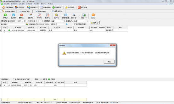 如果相應的收款單已經審核過了,此時刪除時,系統(tǒng)會提示“當前收款單已審核,不允許進行刪除操作!(如確需刪除請先反審)”,如下圖五所示。