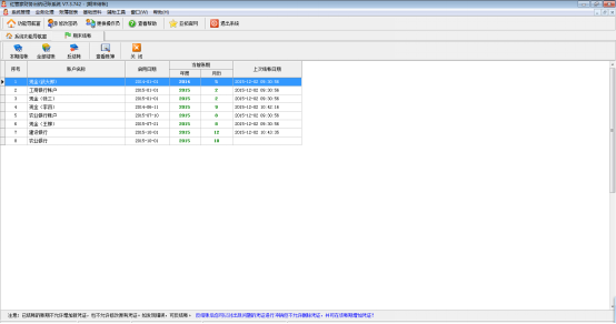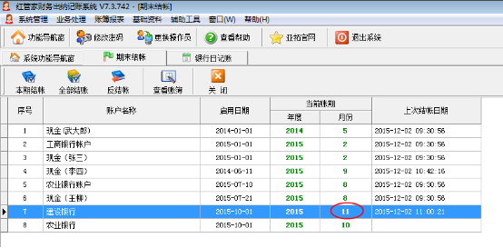 本期結帳:在帳戶列表中,選擇一個帳戶,點擊工具欄中的“本期結帳”按鈕即可。已結賬的賬期不允許增加新憑證,也不允許修改原有憑證。如發現錯誤,可以反結賬。
