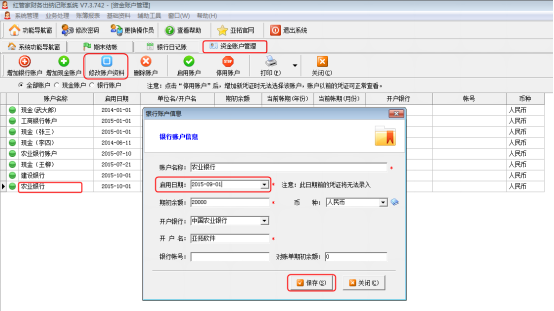 此時如果需要進行反結賬操作,首先要修改該資金賬戶是“啟用日期”,使“啟用日期”的所屬月份小于當前賬期的月份,然后才能進行反結賬。點擊主窗口菜單“基礎資料”——》“資金賬戶”系統進入“資金賬戶管理”窗口,選擇該資金賬戶“農業銀行”,點擊“修改賬戶資料”按鈕,調整“啟用日期”,然后保存,如圖6所示。