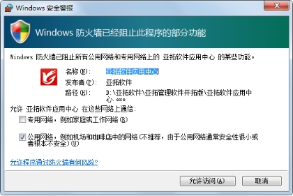 首次運(yùn)行應(yīng)用中心程序,如果防火墻彈出提示窗口,則Win7系統(tǒng)請(qǐng)點(diǎn)擊“允許訪問(wèn)”按鈕允許訪問(wèn)(專有網(wǎng)絡(luò)不需要打勾選擇);WinXP系統(tǒng)請(qǐng)點(diǎn)擊“解除阻止”按鈕即可。
