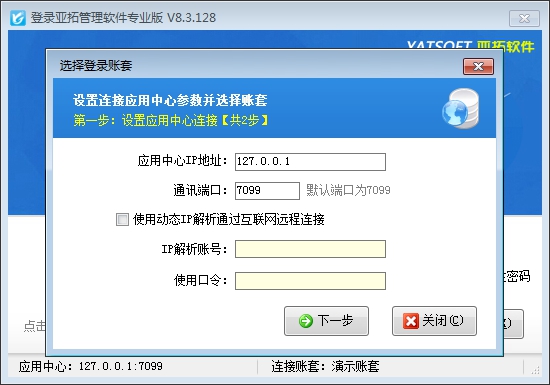 點(diǎn)擊桌面上的“亞拓管理軟件”程序(以下簡(jiǎn)稱“客戶端程序”)圖標(biāo)(或者在開(kāi)始菜單中點(diǎn)擊程序組中的相應(yīng)功能),即可打開(kāi)客戶端程序。點(diǎn)“選擇賬套”按鈕,可以輸入“應(yīng)用中心”所在電腦(即主機(jī)電腦)的IP地址以及通訊端口,如果是通過(guò)互聯(lián)網(wǎng)遠(yuǎn)程連接請(qǐng)輸入購(gòu)買(mǎi)動(dòng)態(tài)IP解析服務(wù)后我們提供的IP解析帳號(hào)和使用口令,然后點(diǎn)“下一步”按鈕,選擇要登錄的賬套。