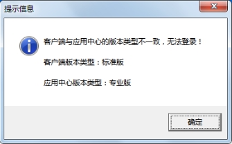 ③如果登錄的時(shí)候提示如下信息,則表明客戶端程序的版本類型與主機(jī)電腦上的應(yīng)用中心程序的版本類型不一致,請(qǐng)使用相同版本類型的程序登錄即可。
