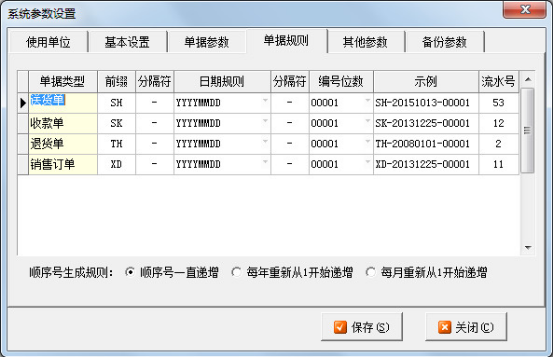2、順序號(hào)生成規(guī)則設(shè)置:可配置各類單據(jù)按順序號(hào)一直遞增、每年重新從1開始遞增以及每月重新從1開始遞增,將各項(xiàng)數(shù)據(jù)配置好之后點(diǎn)擊保存即可。