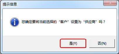 選擇一個(gè)客戶“星光糧油店”后點(diǎn)擊“更多操作”—》“設(shè)置為供應(yīng)商”,系統(tǒng)會(huì)彈出提示信息“您確定要將當(dāng)前選擇的“客戶”設(shè)置為“供應(yīng)商”嗎?”,如圖2所示,點(diǎn)擊“是”按鈕,該客戶信息就轉(zhuǎn)變?yōu)楣⿷?yīng)商信息了。