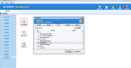 在功能導航窗中點擊“系統(tǒng)管理”—》“系統(tǒng)參數(shù)配置”,即可進入“系統(tǒng)參數(shù)設置”界面,點擊“業(yè)務參數(shù)”,如圖1所示,在系統(tǒng)安全及權限參數(shù)內可以打鉤啟用“啟用倉庫權限”參數(shù)。