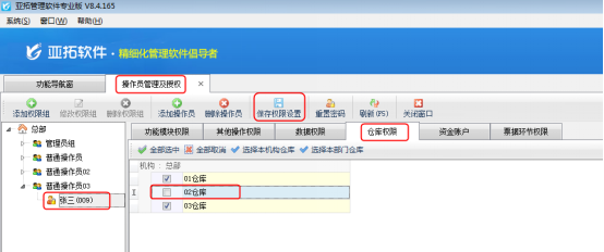 亞拓管理軟件、紅管家倉庫管理軟件都可以設置操作員的倉庫控制權限,下面我們以亞拓管理軟件專業(yè)版為例介紹一下如何設置操作員的倉庫控制權限。