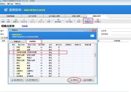打開軟件的“銷售管理”模塊,新開一個(gè)銷售出庫(kù)單,點(diǎn)擊“界面設(shè)計(jì)”選擇“單據(jù)明細(xì)”數(shù)據(jù)項(xiàng),找到“當(dāng)前庫(kù)存數(shù)量”數(shù)據(jù)項(xiàng)并勾選上,保存界面設(shè)計(jì)。具體如圖1所示:
