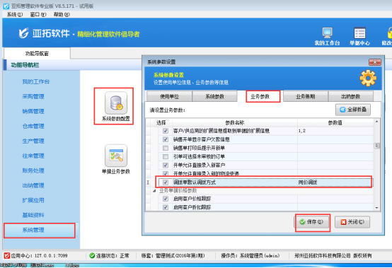 以亞拓管理軟件為例,首先設(shè)置參數(shù),在導(dǎo)航窗“系統(tǒng)管理”->系統(tǒng)參數(shù)配置->選擇“業(yè)務(wù)參數(shù)”的“調(diào)撥單默認(rèn)調(diào)撥方式”,后邊的參數(shù)值可選擇同價(jià)調(diào)撥或者變價(jià)調(diào)撥(示例選擇同價(jià)調(diào)撥)。勾選上此參數(shù)保存即可。具體如下圖: