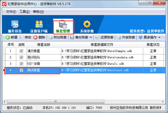 賬套即賬套數(shù)據(jù)庫(kù),這是一個(gè)從會(huì)計(jì)業(yè)務(wù)引申出來(lái)的概念,賬套數(shù)據(jù)庫(kù)中存儲(chǔ)業(yè)務(wù)數(shù)據(jù)。使用軟件前建議新增加一個(gè)賬套,用于重新錄入和管理數(shù)據(jù)。本軟件的賬套是集中在主機(jī)電腦上的應(yīng)用中心程序(紅色圖標(biāo))上進(jìn)行的。我們公司的亞拓管理軟件、紅管家送貨單軟件、紅管家出納軟件等都支持新建多賬套使用。以紅管家送貨單為例,示范下如何進(jìn)行新建賬套和選擇新賬套使用軟件?