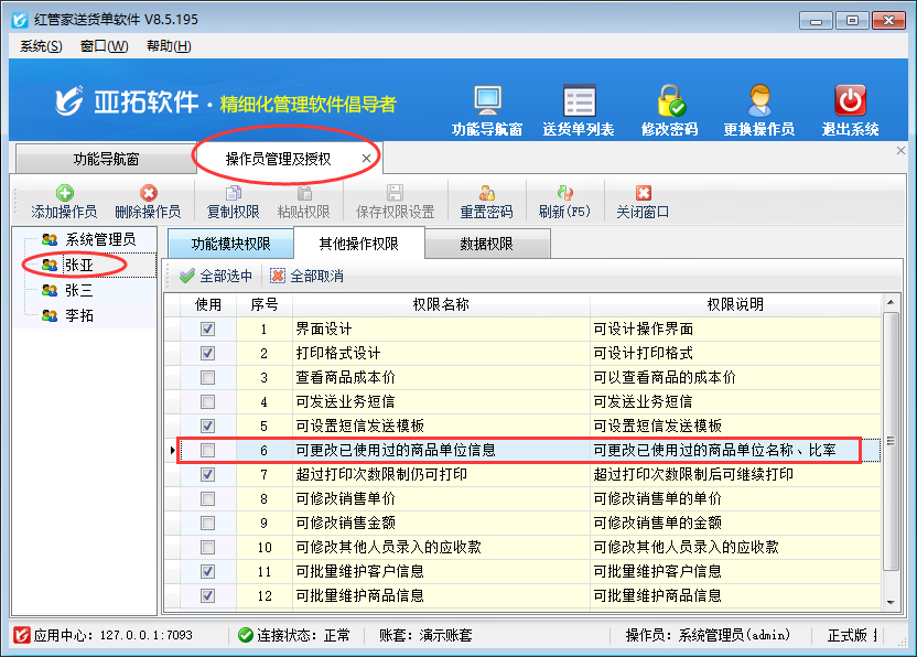 在功能導(dǎo)航窗點(diǎn)“系統(tǒng)管理”→“操作員及授權(quán)”即可進(jìn)入“操作員管理及授權(quán)”界面,選中操作員賬號(hào),在“其他操作權(quán)限”界面將“可更改已使用過(guò)的商品單位信息”權(quán)限打鉤取消,如下圖一所示,設(shè)置操作員賬號(hào)“張亞”不可更改已使用過(guò)的商品單位信息,設(shè)置完成后點(diǎn)擊“保存權(quán)限設(shè)置”按鈕保存設(shè)置。