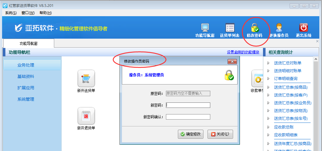亞拓管理軟件(進(jìn)銷存管理軟件)及紅管家系列軟件(紅管家出納記賬軟件、紅管家送貨單軟件、紅管家倉庫管理軟件、紅管家票據(jù)打印軟件等),操作員(系統(tǒng)管理員Admin)默認(rèn)都是沒有密碼的,即首次登錄的時(shí)候不需要輸入密碼,直接點(diǎn)擊“登錄”按鈕即可登錄軟件。建議正式使用軟件后,可以對每個(gè)操作員設(shè)置一下密碼,本篇文章我們以紅管家送貨單軟件為例來演示一下如何設(shè)置操作員密碼。