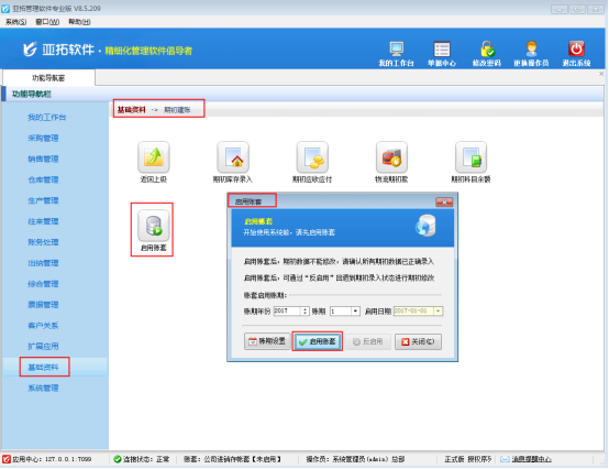 啟用賬期:是指準(zhǔn)備從哪個(gè)月份開始使用軟件(例如:假設(shè)當(dāng)前月份為2017年8月份,但我們想從2017年1月份開始使用軟件,可以將啟用賬期設(shè)置為2017年、賬期為1,這樣我們需要整理的期初數(shù)據(jù)就應(yīng)該是截止到2017-01-01前的期初應(yīng)收應(yīng)付款、期初商品庫(kù)存,開賬后就可以錄入2017-01-01之后的業(yè)務(wù)單據(jù))。