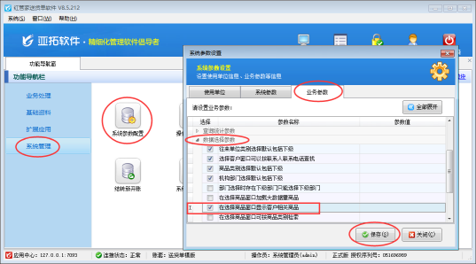 在功能導航窗點擊“系統管理”—》“系統參數配置”—》“業務參數”,即可進入到“業務參數”配置界面,在數據選擇參數內打鉤啟用“在選擇商品窗口顯示客戶相關商品”參數,然后點擊“保存”按鈕保存設置,如下圖二所示。