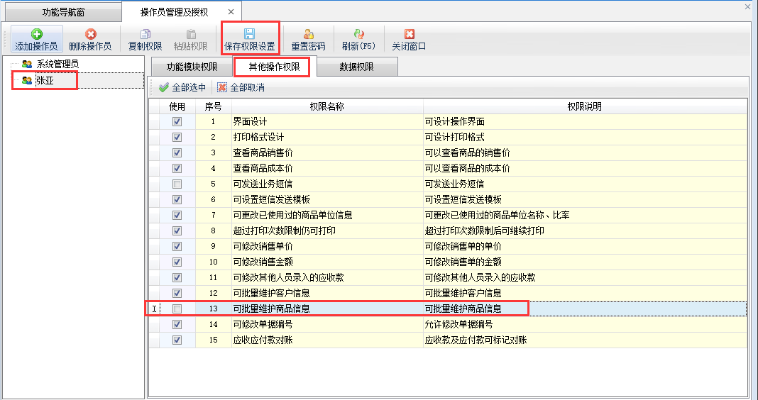 在功能導(dǎo)航窗點“系統(tǒng)管理”→“操作員及授權(quán)”即可進入“操作員管理及授權(quán)”界面,選中操作員賬號,在“其他操作權(quán)限”界面將“可批量維護商品信息”權(quán)限打鉤取消,然后保存權(quán)限設(shè)置,如下圖一所示,設(shè)置操作員“張亞”沒有“可批量維護商品信息”權(quán)限。