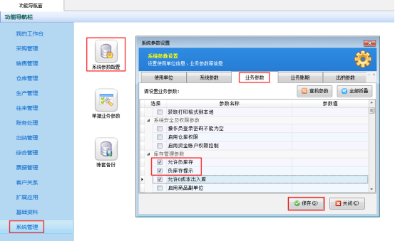 在功能導(dǎo)航窗點(diǎn)擊“系統(tǒng)管理”—》“系統(tǒng)參數(shù)配置”—》“業(yè)務(wù)參數(shù)”,即可進(jìn)入到“業(yè)務(wù)參數(shù)”配置界面,在庫(kù)存管理參數(shù)內(nèi)找到“允許負(fù)庫(kù)存”、“負(fù)庫(kù)存提示”參數(shù),勾選這兩個(gè)參數(shù),然后保存,如下圖1所示: