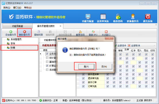 亞拓軟件旗下的亞拓管理軟件、紅管家送貨單軟件、紅管家出納記賬軟件等支持在軟件中設置多個操作員進行登錄軟件。許多用戶存在業(yè)務員離職后,其操作員權限仍存在,可以繼續(xù)使用其姓名進行開單操作。為了避免選擇離職員工登錄軟件開單,軟件支持可以刪除已離職或者不允許再登錄軟件的操作員的登錄權限。