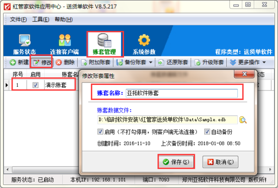 以“紅管家送貨單軟件”為例,示范下如何修改賬套的名稱。打開紅色的應(yīng)用中心程序(如已打開可在桌面右下角尋找下紅色圖標(biāo)),在賬套管理界面,點(diǎn)擊賬套后選擇工具欄中的修改按鈕,彈出修改賬套名稱界面,把“演示賬套”修改為“亞拓軟件賬套”然后點(diǎn)擊“保存”按鈕,如下圖1所示: